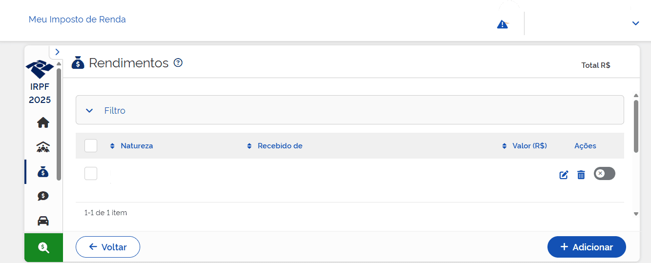 2. Inclua os rendimentos