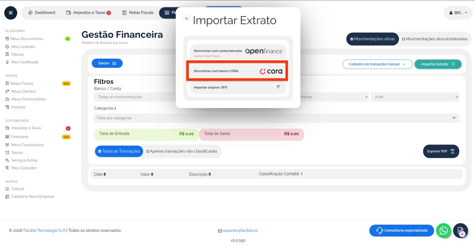A parceria entre a Cora e a Facilite existe para unir a agilidade de um banco digital exclusivo para PJ, com a automação contábil, eliminando o trabalho manual de exportar extratos e conferir pagamentos.