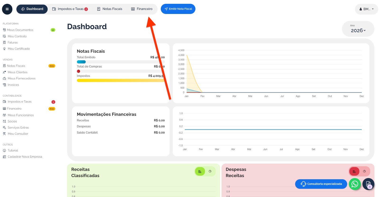 Passo 1: Acesse o dashboard da Facilite, clicando na opção Financeiro.